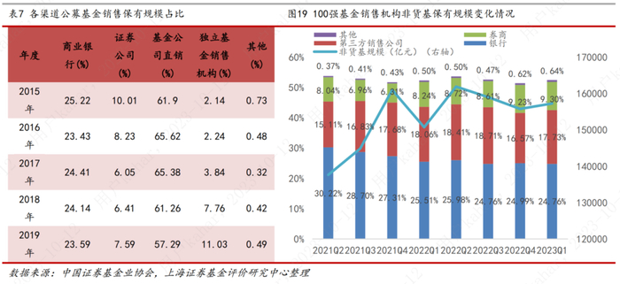 在此背景下,公募基金募集机构展开激烈的市场化竞争。由于近年互联网的快速发展,以互联网基金销售为代表的第三方基金销售机构开始崛起,形成了由基金公司、银行、券商、第三方销售机构组成的多元化销售体系。从中基协公布的数据来看,银行渠道的非货基保有规模虽有所下降,但依旧占据优势,第三方销售机构非货基保有规模保持相对稳定,券商渠道的非货基保有规模逆势上涨。