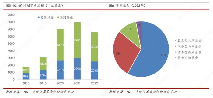 养老金等长期资金的持续入市,成为美国共同基金的稳定资金来源。以401(k)计划为例,其到2022年底持有6.6万亿美元的资产,其中共同基金是401(k)计划的主要投资工具,其占比从1990年底的9%上升到2022年底的62%。而这4万亿资产中有58%的资产投向了股票型共同基金。