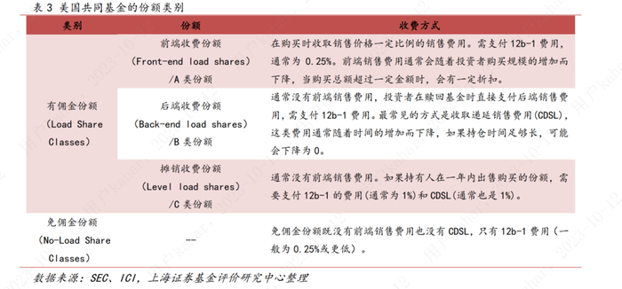美国共同基金的销售佣金和12b-1费用主要用于补偿经纪人和金融专业机构的服务。共同基金按是否涵盖销售费用,可以被分为有佣金份额(load share classes)和免佣金份额(no-load share classes)。有佣金份额的投资者通过金融专业机构购买基金份额,而免佣金份额的投资者不通过金融专业机构购买基金份额(通常直接在基金公司进行购买)或者通过金融专业机构购买但是单独支付金融专业机构投顾费用。