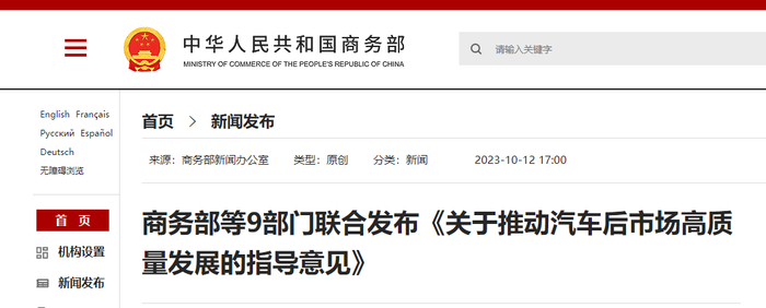 又一促进汽车消费的配套政策将落地。10月12日消息,近日,商务部等9部门联合发布《关于推动汽车后市场高质量发展的指导意见》(以下简称《指导意见》),力推汽车后市场高质量发展。