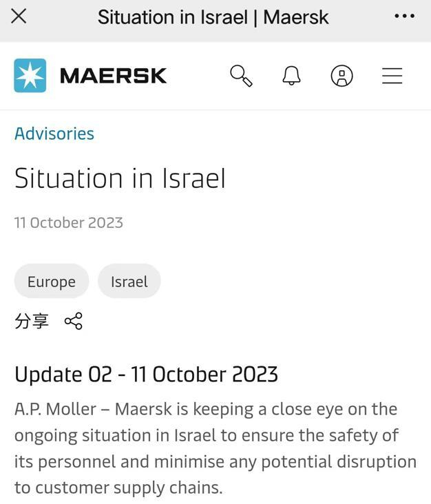 同日,马士基在官网发文称,目前,以色列主要码头的港口运营仍在正常运作,马士基将继续接受往返当地的预订。