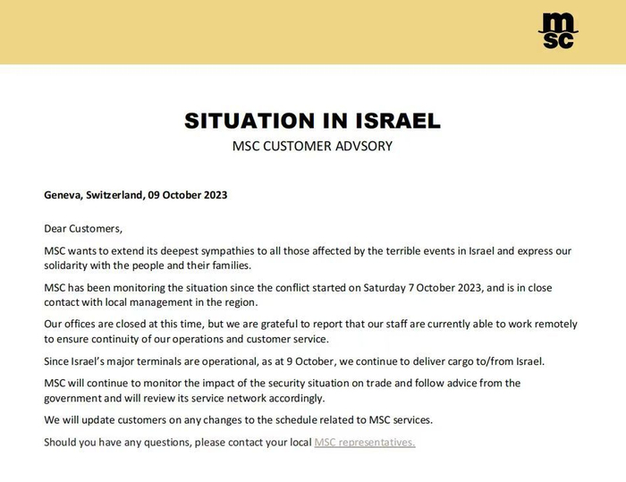 MSC地中海航运公司也公告称,截至10月9日,继续运送货物进出以色列。