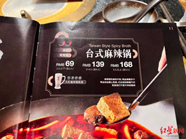 苏州大学王健法学院学生小姜告诉红星新闻记者,当时她与另外两位朋友用餐时点的是4人鸳鸯锅,台式麻辣锅和红颜花椒鸡双拼。点完锅底,小姜就询问服务员,自己是3个人用餐,3人和4人有何区别。得到的回答是无论3人还是4人,都是按照4人的锅底收费。随即小姜又问2人和3人用餐锅底是否一样?服务员的回答是,2人的锅底也是按照4人的锅底出的,只是按照人数收费。