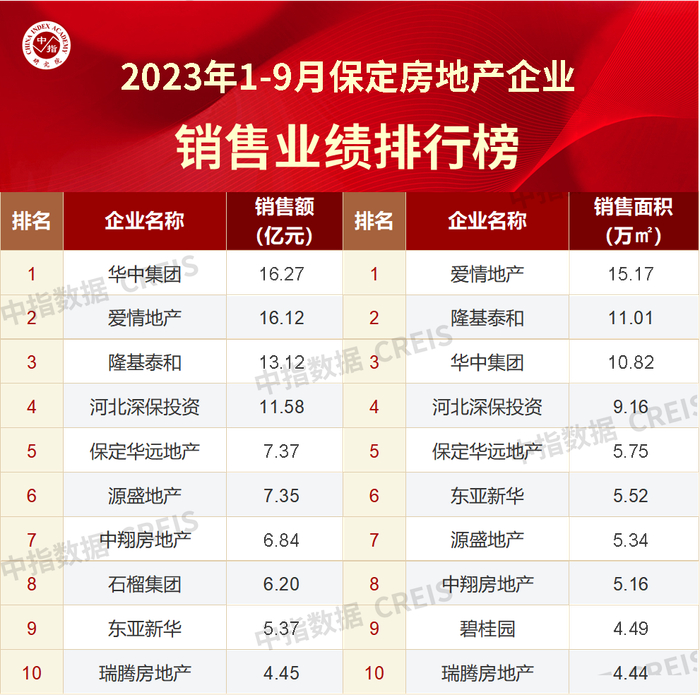 特别声明:房地产企业销售数据统计是以2023年1月1日-9月30日期间销售的并表商品房(包括商品住宅、写字楼、商业、公寓等)为统计口径,主要依据中指数据CREIS(点击查看)在保定市域范围(统计范围:莲池区、竞秀区、满城区、清苑区、徐水区)的销售监测数据,并参考当期总体经营情况和推盘去化情况进行分析统计;对于少数没有在监测范围内的企业和项目,由企业提供相关文件,经严格项目审核和数据复核,也纳入统计范围。本报告仅供参考,不对使用报告及其内容所引发的任何直接或间接损失承担责任。