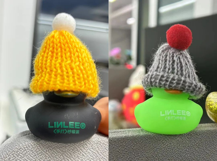 这些鸭子都来自一个最近突然火起来的柠檬茶品牌林里,买一杯送一只,通过留言和暗号可以选择心仪的鸭子和配饰。一杯柠檬茶20多元,就为一只小鸭子?“拼多多20元能直接买一兜子鸭子和配件,不比喝林里的柠檬茶香?”
