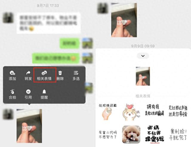 方法:长按表情包,点击【相关表情】,就会出现一堆相似表情包,选一个发送就不会冷场啦~