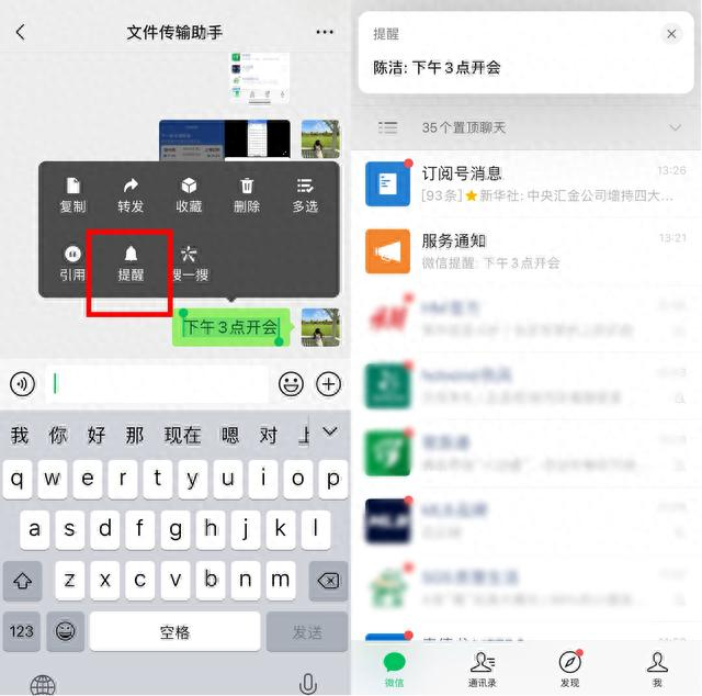 第一步:长按聊天对话中的某一条消息,选择“提醒”,设置一个提醒时间