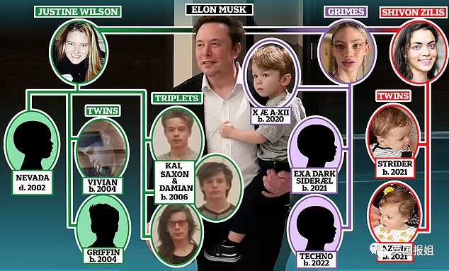 马斯克和第一任老婆生了六娃,大儿子夭折后,通过人工受孕诞下一对双胞胎、一组三胞胎;