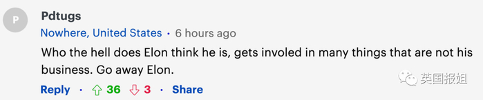“埃隆·马斯克以为他是谁?参与那么多不该他沾边的事情,走开!”