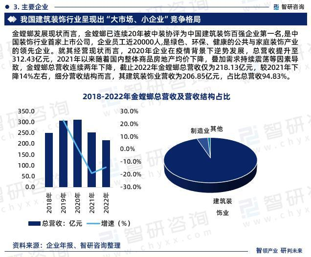 金螳螂发展现状而言,金螳螂已连续20年被中装协评为中国建筑装饰百强企业第一名,是中国装饰行业首家上市公司,企业员工近20000人,是绿色、环保、健康的公共与家庭装饰产业的领先企业。就其经营现状而言,2020年企业在疫情背景下逆势发展,总营收提升至312.43亿元,2021年以来随着国内整体商品房地产均价下降,叠加需求持续震荡等因素导致,金螳螂总营收连续两年下降,截止2022年金螳螂总营收仅为218.13亿元,较2021年下降14%左右,细分营收结构而言,其建筑装饰业营收为206.85亿元,占比总营收94.83%。