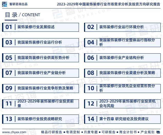 由智研咨询专家团队精心编制的《中国装饰装修行业市场需求分析及投资方向研究报告》(以下简称《报告》)重磅发布,《报告》旨在从国家经济及产业发展的战略入手,分析装饰装修行业未来的市场走向,挖掘装饰装修行业的发展潜力,预测装饰装修行业的发展前景,助力装饰装修业的高质量发展。