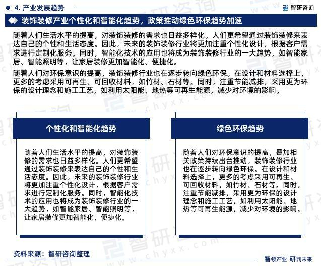 随着人们生活水平的提高,对装饰装修的需求也日益多样化。人们更希望通过装饰装修来表达自己的个性和生活态度。因此,未来的装饰装修行业将更加注重个性化设计,根据客户需求进行定制化服务。同时,智能化技术的应用也将成为装饰装修行业的一大趋势,如智能家居、智能照明等,让家居装修更加智能化、便捷化。