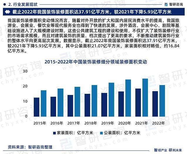 我国装饰装修面积变动情况而言,随着对外开放的扩大和国内居民消费水平的提高,我国旅游业、会展业、餐饮业等现代服务业也得到了快速的发展,涉外酒店、会展中心、剧院等基础设施进入了大规模建设时期,这些公共建筑工程的建设和使用,不仅扩大了装饰装修行业的市场需求规模,而且对建筑装饰的质量、档次提出了更高的要求,不断推动建筑装饰行业的整体水平向更高层次发展。数据显示,截止2022年我国装饰装修面积达37.91亿平方米,较2021年下降5.93亿平方米,其中公装面积21.07亿平方米,家装面积相对略低,约16.84亿平方米。