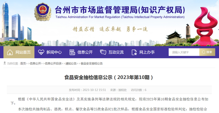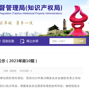 中国质量新闻网讯 近日,浙江省台州市市场监督管理局发布食品安全抽检信息公示(2023年第10期)。