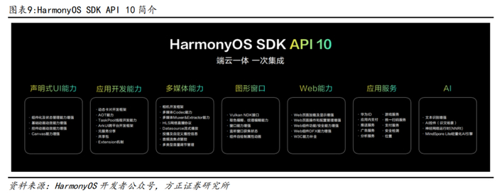 HarmonyOS NEXT开发者预览版亮相 剥离AOSP打造纯鸿蒙生态。华为于2023年8月发布HarmonyOS NEXT开发者预览版,首先面向合作企业开发者开放,而后于2024Q1面向所有开发者开放,最新的版本将剔除Linux内核与安卓AOSP代码,代表华为将进入纯鸿蒙时代。此外,HarmonyOS SDK也升级至API 10,丰富完善了声明式UI能力、应用开发能力、多媒体、图形、WEB等能力,同时加入了更多垂类领域,如安全、AI、账号、消息等方面进一步丰富API接口,实现端云一体,一次集成。