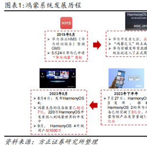 回顾鸿蒙的发展历程,我们看到,在2019年8月,华为正式发布自研操作系统鸿蒙OS,兼容安卓app,主要用于荣耀智慧屏/智慧屏Pro。为了广泛聚集合作伙伴打造万物互联,华为在20年和21年分两次将鸿蒙操作系统的基础能力捐给开放原子开源基金会,各个厂家能够平等地在此处获得代码,根据不同的业务诉求打造产品,由此形成OpenHarmony。此后,在无法调用谷歌GMS服务的背景下,华为果断选用能兼容AOSP的技术路线,叠加自研专利技术和云服务功能,在OpenHarmony基础上开发了HarmonyOS。