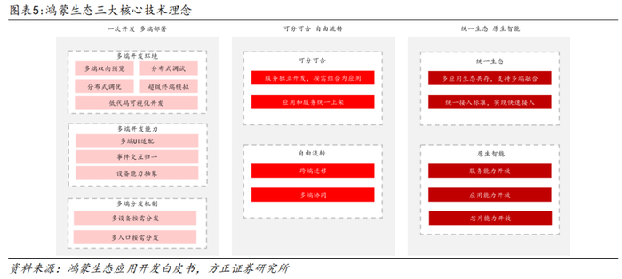 1+8+N”战略叠加三大核心技术理念,鸿蒙系统打造万物互联新时代。2019年,华为提出“1+8+N”全场景智慧生活战略,在此基础上鸿蒙系统的发展不仅让消费者体验到万物互联的便捷性,也通过三大核心技术理念让开发者的开发同样舒畅,围绕5大生活场景,实现一个工程,一次开发上架,多端可按需部署;通过业务解耦将应用分解成若干元服务独立开发,按需根据场景组合成复杂应用;支持跨平台框架接入,主流跨平台开发框架目前已有版本正适配鸿蒙系统,基于这些框架开发的应用能以较低成本迁移至鸿蒙系统。我们认为,双边的便s捷是华为鸿蒙系统能够快速吸引广大用户使用,并由此使得更多开发者介入,形成良性循环的重要基础。