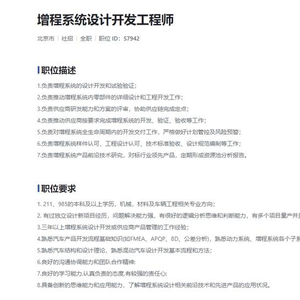 根据招聘信息要求,增程系统设计开发工程师需要有3年以上增程系统设计开发或供应商产品管理的工作经验。而与之相关的动力-燃油系统工程师岗位,则被要求有5年及以上主流OEM或供应商相关开发经验,完整量产项目经历。