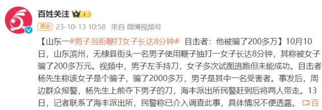 山东一男子当街鞭打女子长达8分钟,目击者:他被骗了200多万