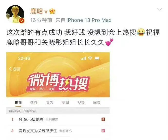 鹿哈时期,凌达乐就已经开始官宣女友“关晓桶”。9月17日,在鹿晗发微博庆祝关晓彤生日后,鹿哈也发布相同内容,并@关晓彤,瞬间热搜第一。玩大了之后,鹿哈的回应是,“这次蹭的有点成功,我好贱。”