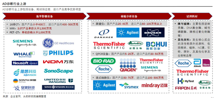 上游环节: AD诊断行业上游包括设备、耗材供应商,主要包括医学影像设备、检验分析设备、试剂耗材,进口产品竞争优势明显