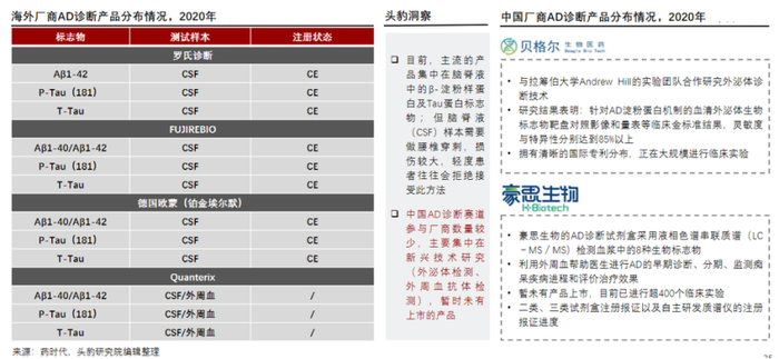 目前,主流的产品集中在脑脊液中的β-淀粉样蛋白及Tau蛋白标志物,中国AD诊断赛道参与厂商数量较少,主要集中在新兴技术研究(外泌体检测、外周血检测)