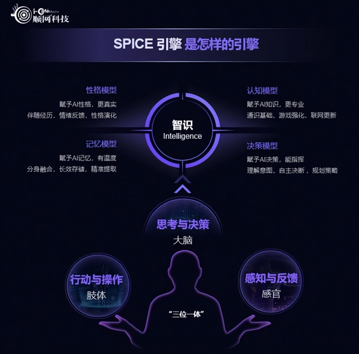 彼时,外界的主要关注点是,顺网科技通过SPICE引擎内部“思考与决策模块”、“行动与操作模块”、“感知与反馈模块”三大模块,构建了具有智能陪伴能力的一整套链路,完成了从外界信息读取,到用决策与陪伴能力提升用户体验的闭环。在技术层面上,它代表着一个完整的AI应用体系,且和普通工具型AI形成了明显区别。