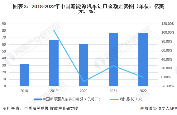从进口金额来看,2018-2022年我国新能源汽车行业进口金额呈波动上升态势。2022年,中国新能源汽车进口总额为76.6亿美元,同比增长0.04%。