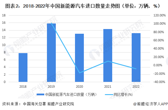2018-2022年,中国新能源汽车进口规模整体呈现波动上涨趋势。2016年中国将新能源汽车列入战略性新兴产业,行业由此进入高速增长期,进口规模不断上升。2020年由于疫情原因,加上特斯拉开始在华国产,导致新能源汽车进口规模有所下降。2022年进口规模达到13.21万辆,同比下降8.07%。