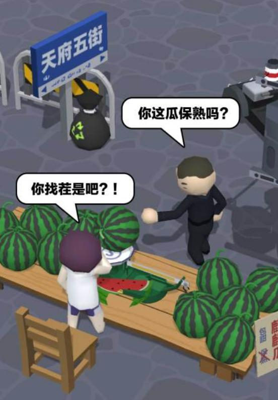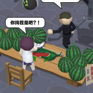 在这款《西瓜摊主大战买瓜人》的游戏中,玩家扮演西瓜摊摊主,买瓜人的小弟会对西瓜摊进行攻击,玩家则用技能来抵挡,这样一直循环,直到西瓜摊血量被打完。