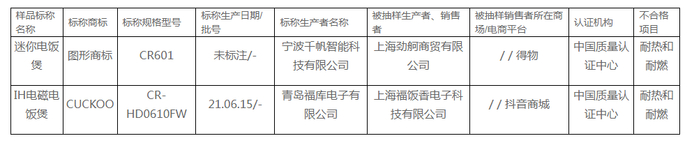 标称青岛福库电子有限公司生产的IH电磁电饭煲(规格型号:CR-HD0610FW 生产日期/批号:21.06.15)“耐热和耐燃”项目不合格,被抽样生产者、销售者为上海福饭香电子科技有限公司,被抽样销售者所在商场/电商平台为抖音商城。