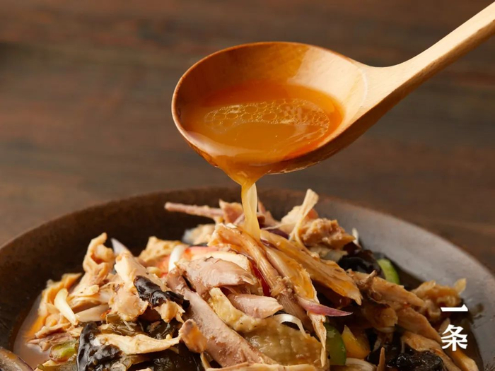 这款椒麻鸡操作还十分简单,热水预热料包、戴上手套撕开鸡肉,放入盘中搅拌均匀,腌制片刻便能开吃,让你10分钟内快速制出一道地道新疆风味大菜。