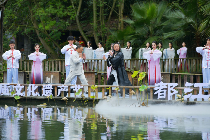 都江堰青城山是中国道教发源地和世界文化遗产地,发源于青城山的青城武术在2021年被列为国家级非遗名录,青城太极作为青城武术的一个重要类别,早已蜚声海内外,有诗云:“青城有太极,绝世而独立。一练倾人城,再练倾人国。”由青城太极名师刘绥滨引领表演的《太极吟》拉开活动的序幕。