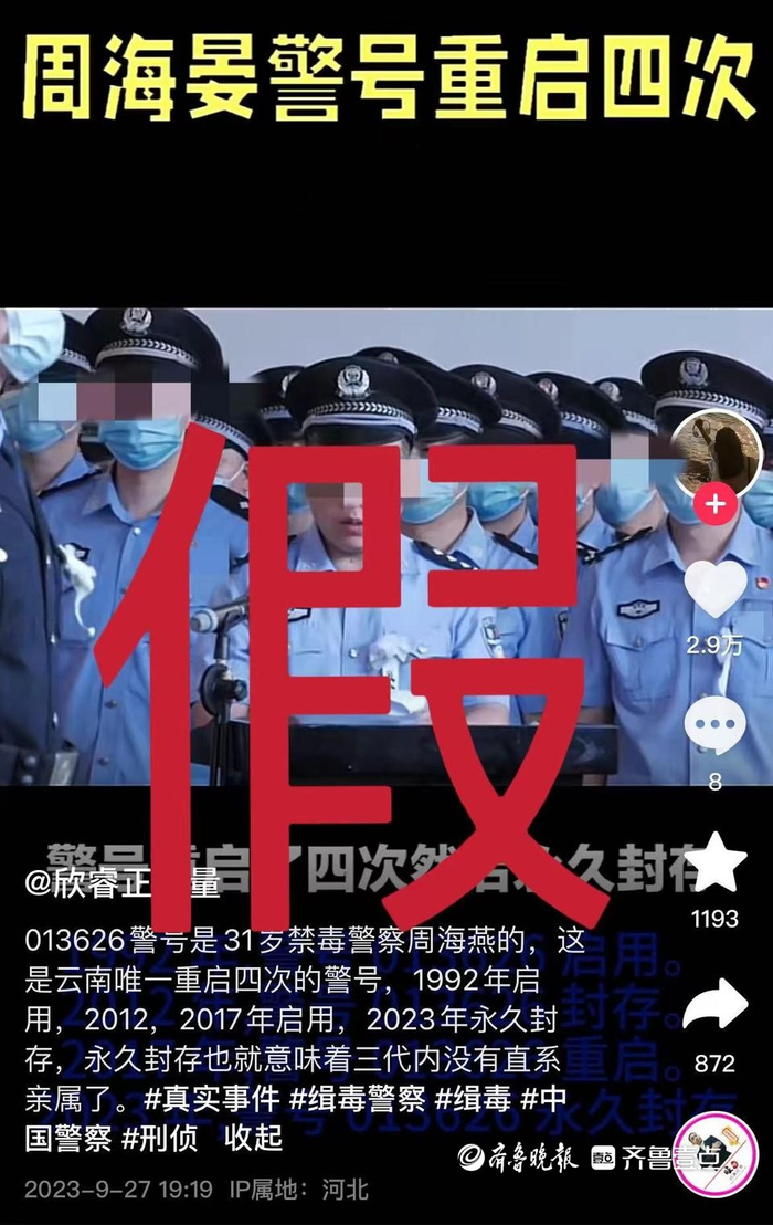 近日,在某短视频平台,一个自媒体博主发布了题为“周海晏警号重启四次”的视频,获得了近3万的点赞。该博主提到,周海晏为云南禁毒警察。10月13日,记者从云南警方了解到,此为虚假信息,已向平台举报。