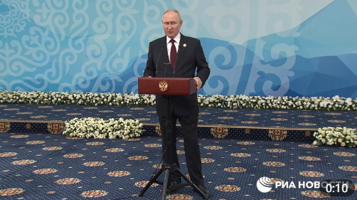 俄新社13日称,这是普京在比什凯克召开记者会的画面。