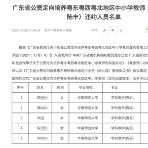 热搜源于广东省陆丰市教育局发布的违约人员名单。根据这份“广东省公费定向培养粤东粤西粤北地区中小学教师(定向汕尾陆丰)违约人员名单”,5名今年6月毕业于华南师范大学的公费师范生因未履行约定,被公开通报。