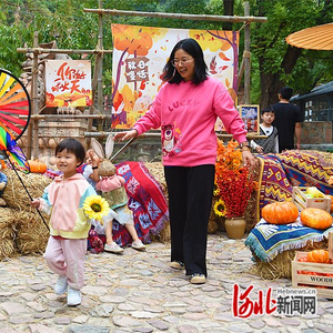 用红辣椒摆成的红五星,用玉米棒装饰的金黄的丰收墙……上山步游路旁的空地上,正在举行一场“你好,秋天”庆丰收活动,黄婉凝的小女儿在这儿玩得不愿离开。她拿着一个五彩风车,在蔬菜瓜果等各种地方农特产品前跑来跑去,兴奋得咯咯直笑。