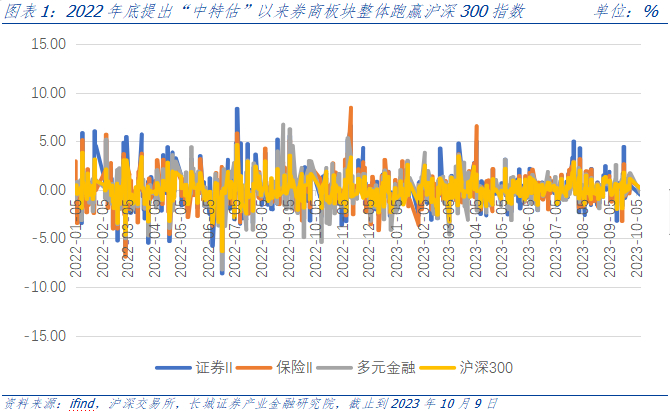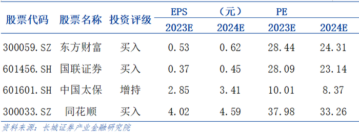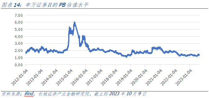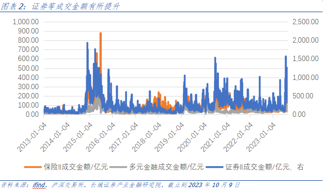 2022年11月,监管层提出了中国特色估值体系,为资本市场发展提供了活力。2023年7月24日,高层召开会议,分析研究当前经济形势,部署下半年经济工作。会议表示当前宏观经济发展平稳,总体呈现复苏态势。但经济恢复不是一帆风顺、一蹴而就的过程,而是波浪式发展、曲折式前进的过程。因此,既要凝聚经济发展信心,又要提升产业发展活力。会议首次提到了要活跃资本市场,提振投资者信心。年初截至2023年10月9日,申万证券指数+7.31%,沪深300指数-4.70%,前者跑赢后者+12.01pct,亦跑赢了保险、多元金融指数。截止到9月末,两市日均成交金额9281.28亿元,同比-4.25%。板块成交金额方面,5月9日成交额为 928.79亿元,创下年初以来成交额的阶段性高点;7月24日,高层召开会议后,板块成交持续活跃,8月4日达到 1564.68亿元高点,后续有所承压回落。