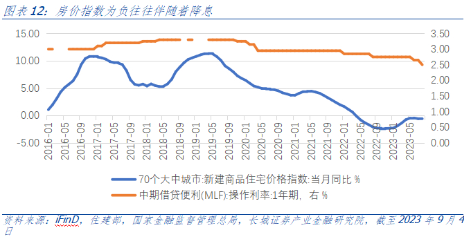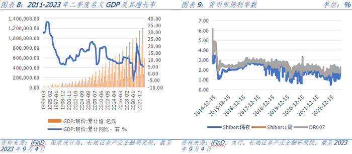 今年以来货币政策坚持稳健取向,实现了较好的调控效果,经济运行实现良好开局。2023年第一季度GDP总量接近28.5万亿元,同比+4.5%。但国内经济内生动力还不强,需求仍然不足。市场对经济增长预期斜率有所放缓,从强复苏走向弱复苏。4月中下旬以来多维度高频数据也印证市场预期,宣告一季度活跃的经济动能开始降温。4月以来地产销售表现回落,未来一段时间地产下滑趋势或将延续。2023年第二季度GDP总量达到30.8万亿元,同比+4.8%,以及后续公布的社融、CPI等数据显示经济修复动能仍显不足。历史数据经验表明,房地产销售下行,往往伴随着降息的可能性,并且打开了降息空间,因此货币政策可能是宽松的。