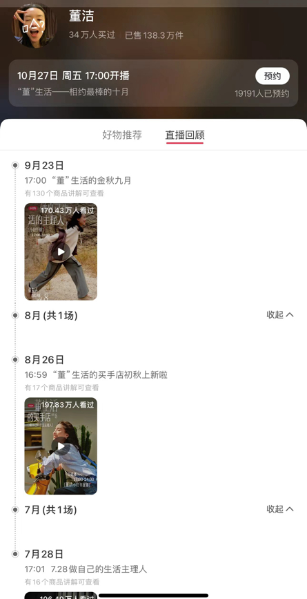 从董洁的小红书直播动态看,董洁的小红书直播间的频率基本在每个月一场,最近三个月的直播间主题分别为“做自己的生活主理人”“‘董’生活的买手店初秋上新啦”“‘董’生活的的金秋九月”。