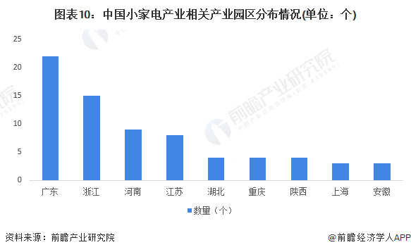 截至2023年9月中旬,我国小家电产业相关的产业园区共有86个,主要分布在广东省、浙江省、河南省、江苏省,其中广东省共有22个数量第一。广东知名小家电企业包括美的集团、新宝股份、小熊电器等。广东小家电相关产业园包括珠海格力高端智能电器(高栏)产业园、米风电器产业园、美的厨房电器工业园、广东美的厨卫电器制造有限公司净饮工业园、美的生活电器制造有限公司楼花工业园、美的生活电器制造有限公司第二工业园、美的微波电器工业园、皮阿诺橱柜·衣柜·电器工业园、圣迪威电器产业园、中山市天朗电器工业园等。