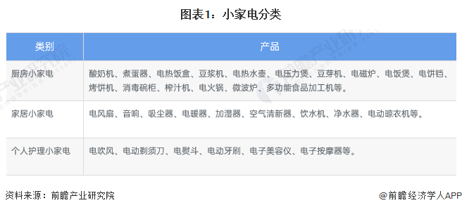 家用电器,简称家电,是指以电能来进行驱动(或以机械化动作)的家庭电器用具,可帮助执行家庭杂务。家电基本上可以分为大型家电和小家电。大型家电与小家电相比体积较为宽大,不易运送且较常固定摆放在一个位置,此外也可能因其耗电量较大而需要有特殊的装置或插头来供应电力。小家电是指一个相对于“大家电”、“白电”、“黑电”的俗称,同时也是相对的概念,其基本特点是体积较小,价值较小,用电量较小。本文对于小家电概念界定如下:小家电指的是体积较小、功率较小且便于携带的,主要用于提升家庭生活品质或者个人生活质量及体验的家用电器。