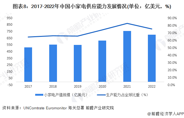 前瞻结合全球小家电贸易数据和零售市场数据测算,2017-2021年全球小家电生产量不断走高,其产值也波动攀升,而中国小家电供应能力由全球整体的64.7%上升至82.9%。2022年,由于受到欧美市场自身环境的影响,我国小家电出口需求下降,导致整体供应出现滑坡,其小家电生产能力为全球的75.6%。