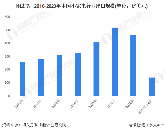 2023年1-4月,我国小家电出口额为140.16亿美元,较去年同期减少约2.7亿美元。