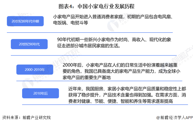 中国小家电行业发展历程可以分为四个阶段,20世纪80年代中期小家电产品开始进入普通消费者家庭,初期的产品包含电风扇、电饭锅、电熨斗等;20世纪90年代新兴小家电作为时尚的象征开始走入城市居民生活;2000年后,小家电产品在人们的日常生活中扮演着越来越重要的角色,中国也开始成为小家电重要的生产基地;2010年后,产品质量和稳定性稳步提高,健康、节能、便捷、智能和养生等需求也刺激行业进一步发展。目前行业进入多品类、高质量、智能化的全新阶段。