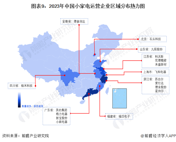 截至2023年9月,根据中国企业数据库企查猫,从企业主体注册地分布来看,中国小家电企业主要分布在珠三角及华东区域,特别以广东和浙江为代表。而从小家电产业链相关上市企业分布情况来看,两地也是聚集了众多的企业,如广东的美的集团、格力电器、新宝股份、小熊电器,浙江的苏泊尔、爱仕达、德业股份等。
