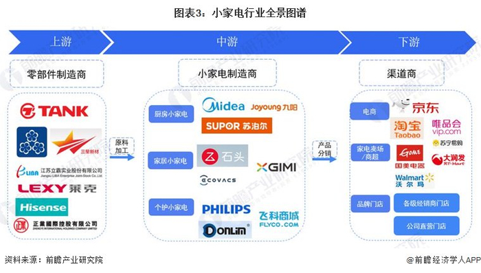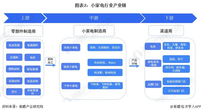 小家电产业链主要分为上游原材料和零部件供应、中游小家电制造和下游小家电销售三大环节。小家电行业上游原材料和零部件包括电加热器、电器阀件、塑料、剥离、金属材料、包装材料等各类零部件供应商,由于各种不同小家电所需原材料零部件不同,因此上游覆盖企业范围较广,品牌也较多元化;中游小家电制造企业包含了国外大企业和国内家电综合制造企业(如美的)、小家电制造企业各类型企业;下游主流销售渠道有综合电商平台(如天猫商城、京东商城等)、线下家电卖场(如苏宁、国美)、大型商超、各级经销商门店、公司直营门店等各类分销渠道。