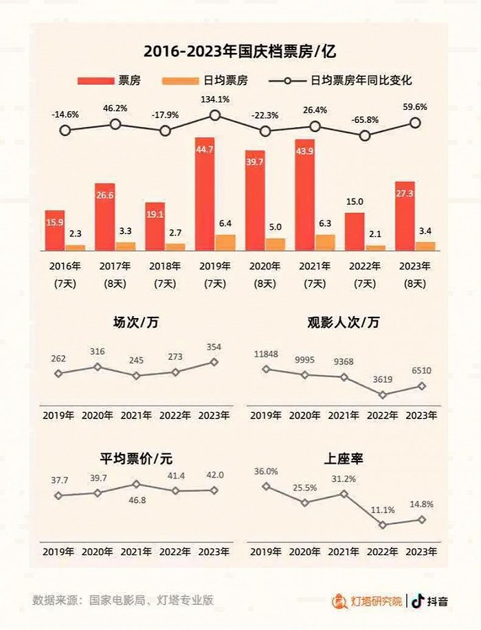近日,雷报从灯塔研究院发布的《2023年国庆档电影市场洞察报告》获悉,截至10月6日21,2023年国庆档总票房达27.23亿,较2022年增长了81.9%,但远低于2019-2021年每年约40亿的票房。