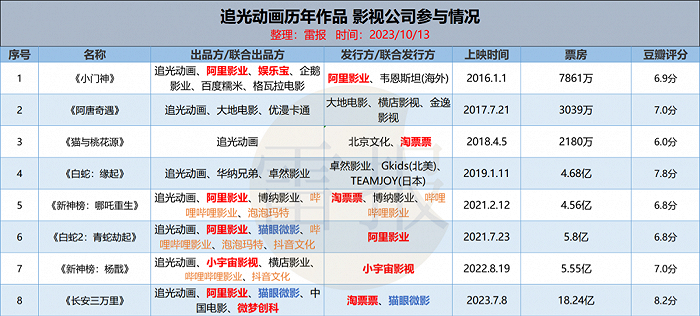 作为对比和延伸,雷报同样也整理了光线影业近十年来的动画电影作品,以及参投公司情况。与追光较为类似,光线的动画电影背后,除了动画公司、各大卫视、国营厂、传统民营电影公司,也不乏腾讯影业、猫眼微影等互联网电影公司的身影。