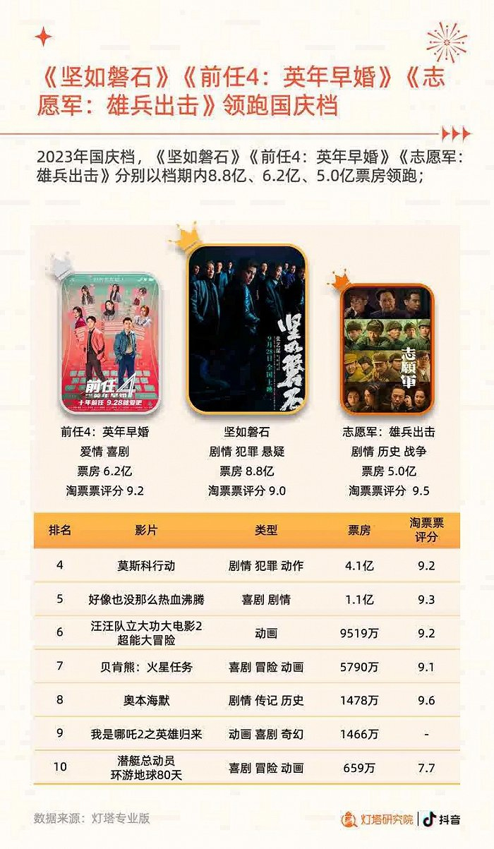 同时,国庆档并未出现票房破10亿的影片,《坚如磐石》成票房冠军,国庆档票房8.80亿元,累计票房9.32亿元,第二到五名则为《前任4:英年早婚》《志愿军:雄兵出击》《莫斯科行动》《好像也没那么热血》。国庆档票房前五名总计票房贡献占比总计为92%,而其他包括6部新上映的动画电影在内的影片,票房总计只占到8%,不足一成。